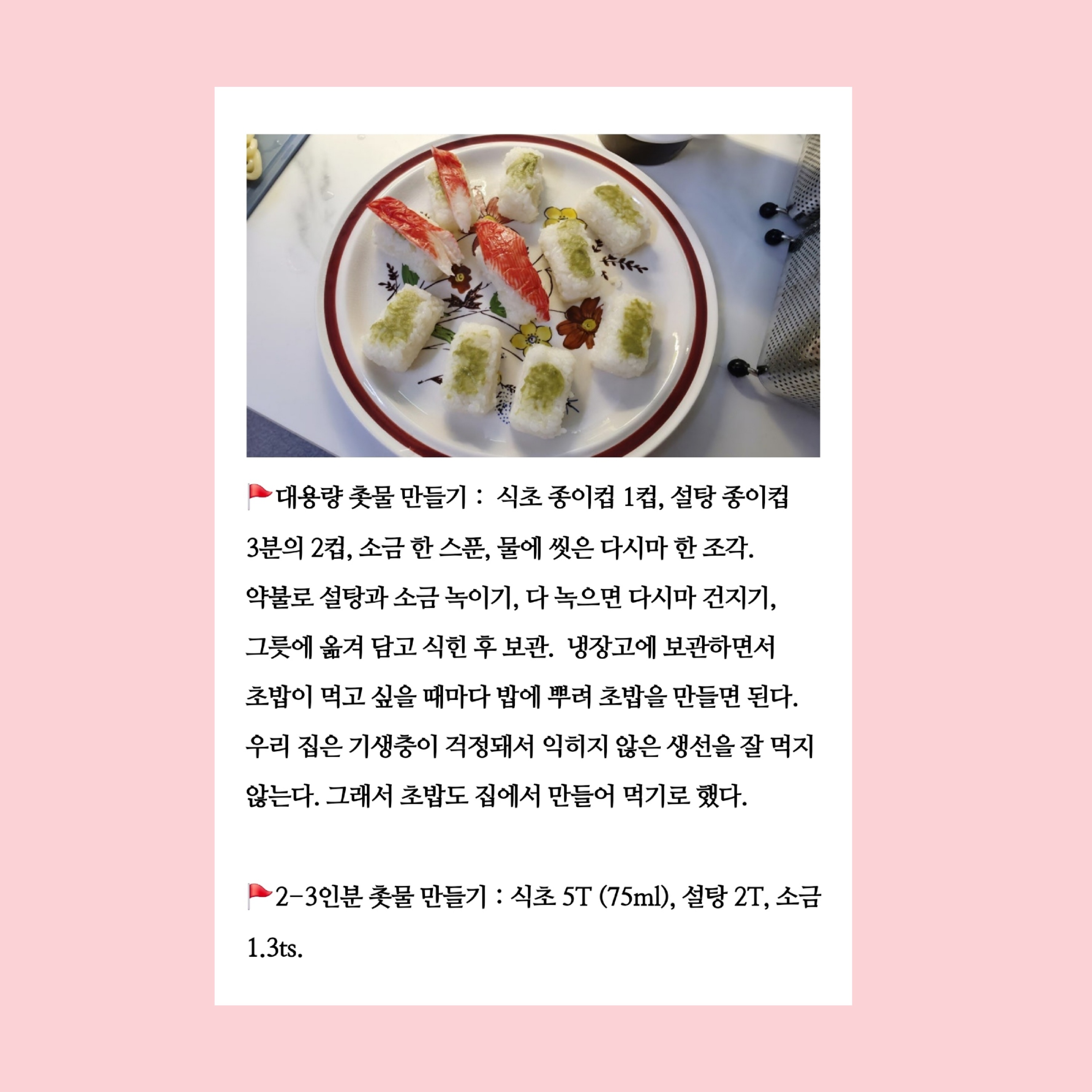 📍2-3인분 촛물 만들기 : 식초 5T (75ml), 설탕 2T, 소금 1.3ts.
