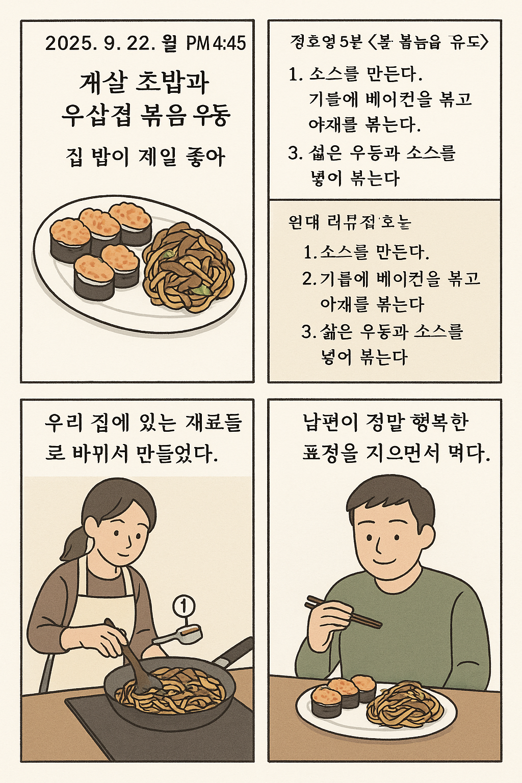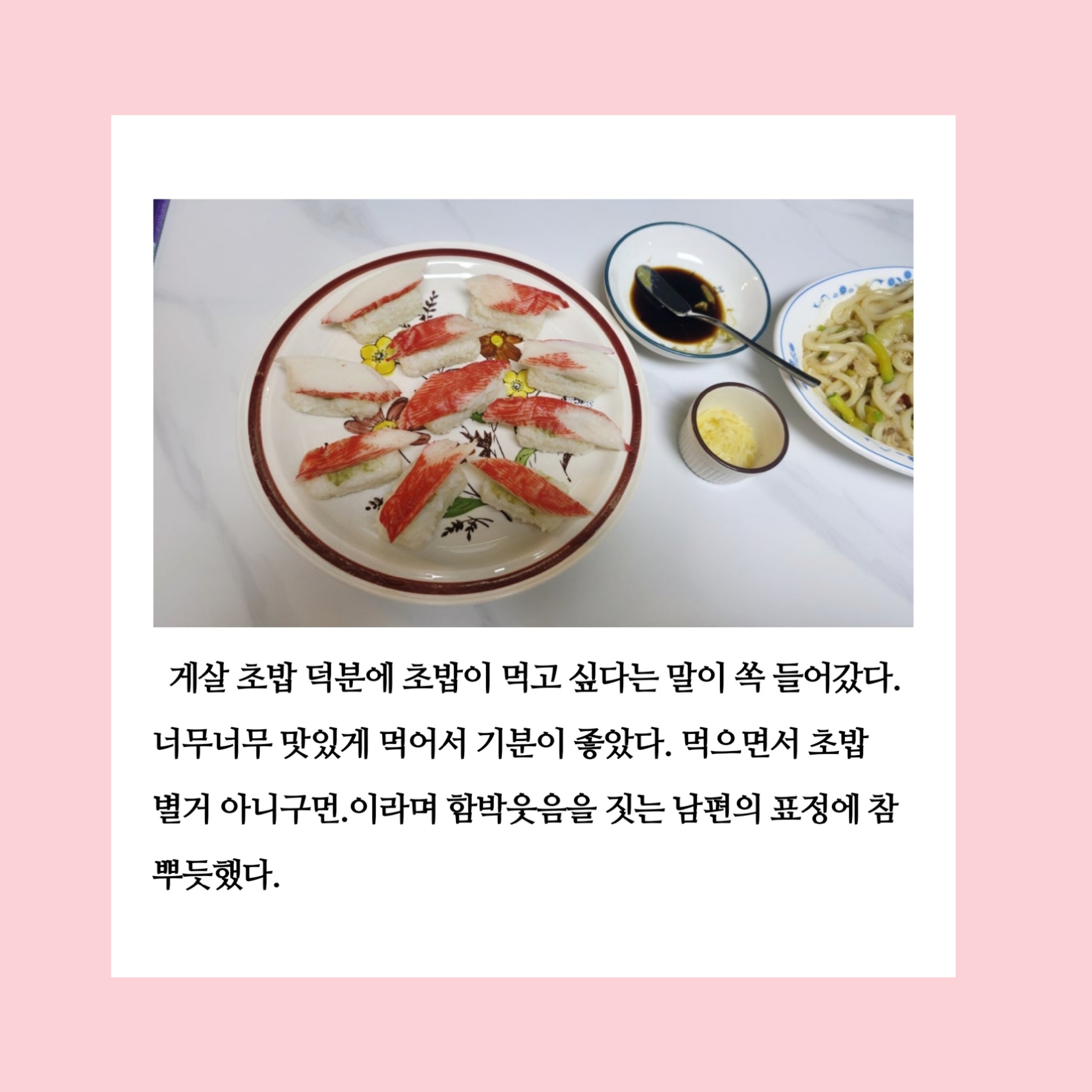 내가 만들 때는 3인분 정도를 만들었기 때문에 소스에 X 3을 했다. 남편이 먹어보고 너무너무너무 맛있다고 해서 행복했다. 내가 먹어도 맛있었다. 다만 아쉬운 건 오징어가 들어갔으면 정말 맛있었을 거라는 생각이 들었다. 볶음 우동은 남편과 연애할 때 학교 근처 맛집에서 자주 먹었던 요리다. 남편이 그때 먹었던 그 맛이 그대로 난다며 오징어가 들어가면 완벽히 똑같았을 거라고 했다. 그때 새우튀김 초밥을 같이 시켜 먹었었는데, 그 맛을 그대로 구현하고 싶어서 게살 초밥도 만들었다. 우리 집 정식 메뉴라며 식탁에 올렸더니 남편이 정말 행복한 표정을 지으면서 먹었다.