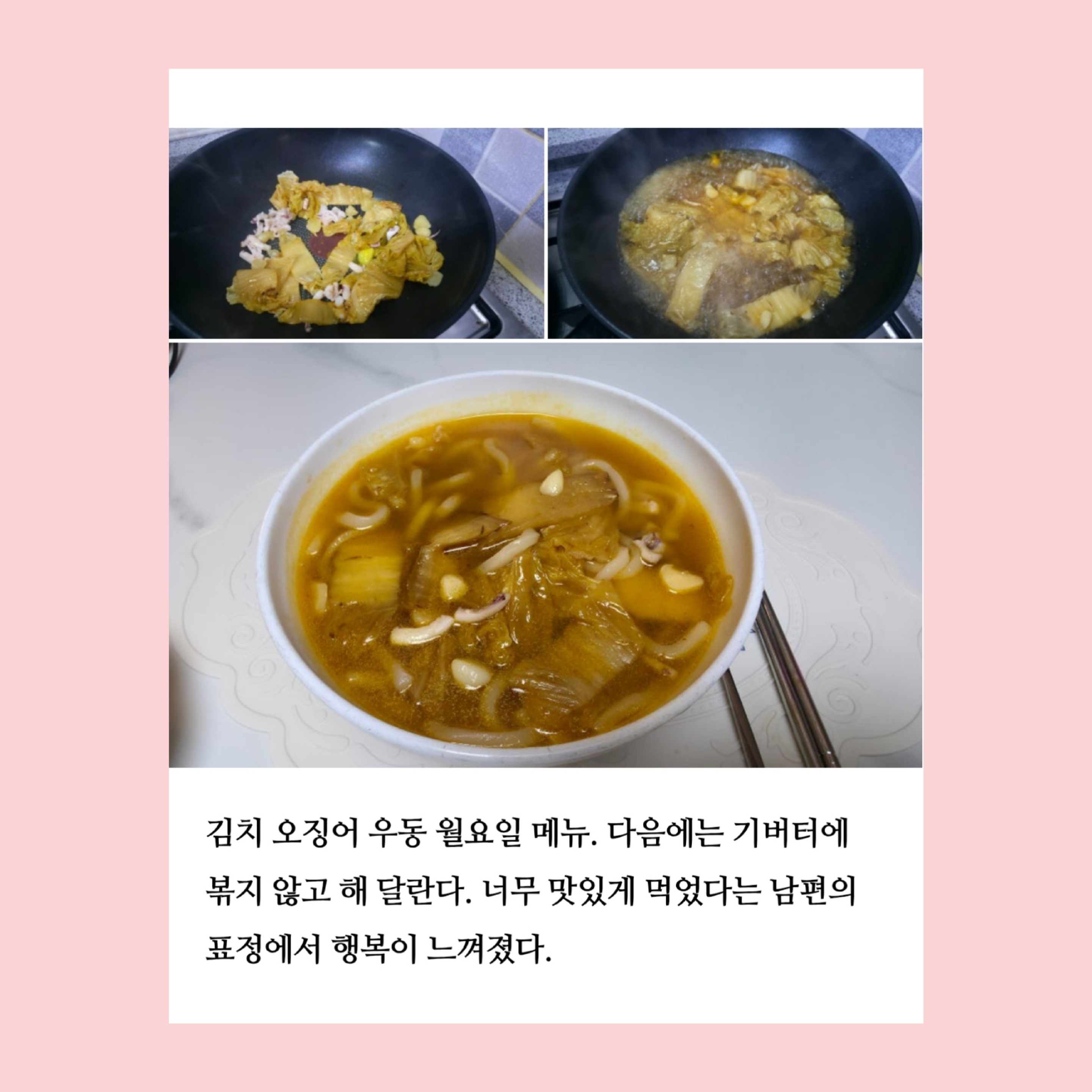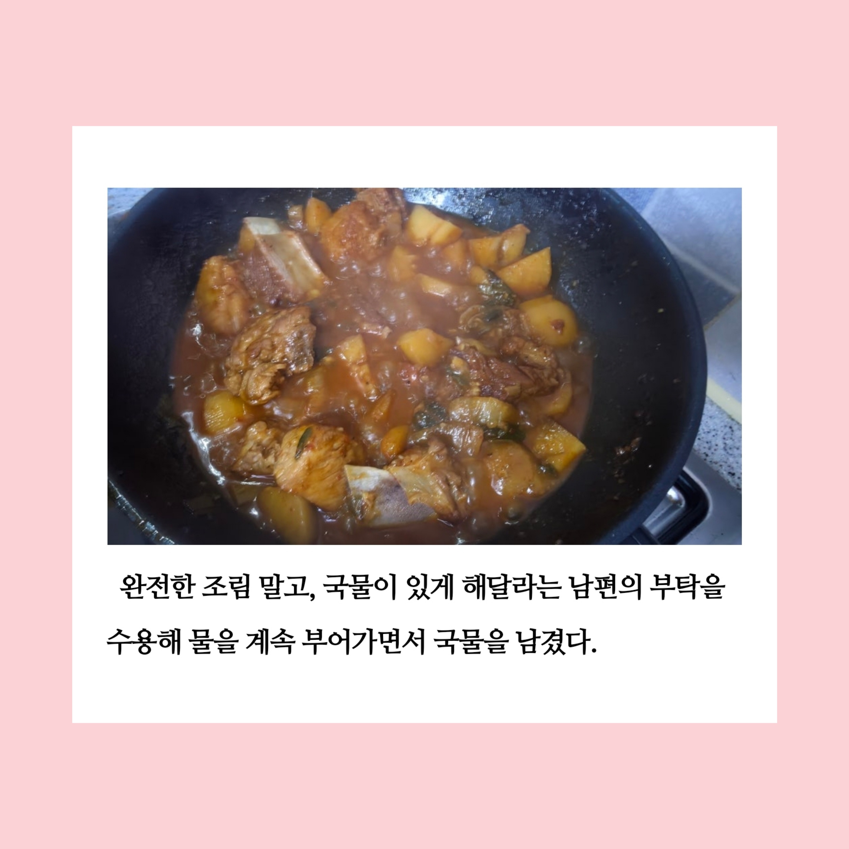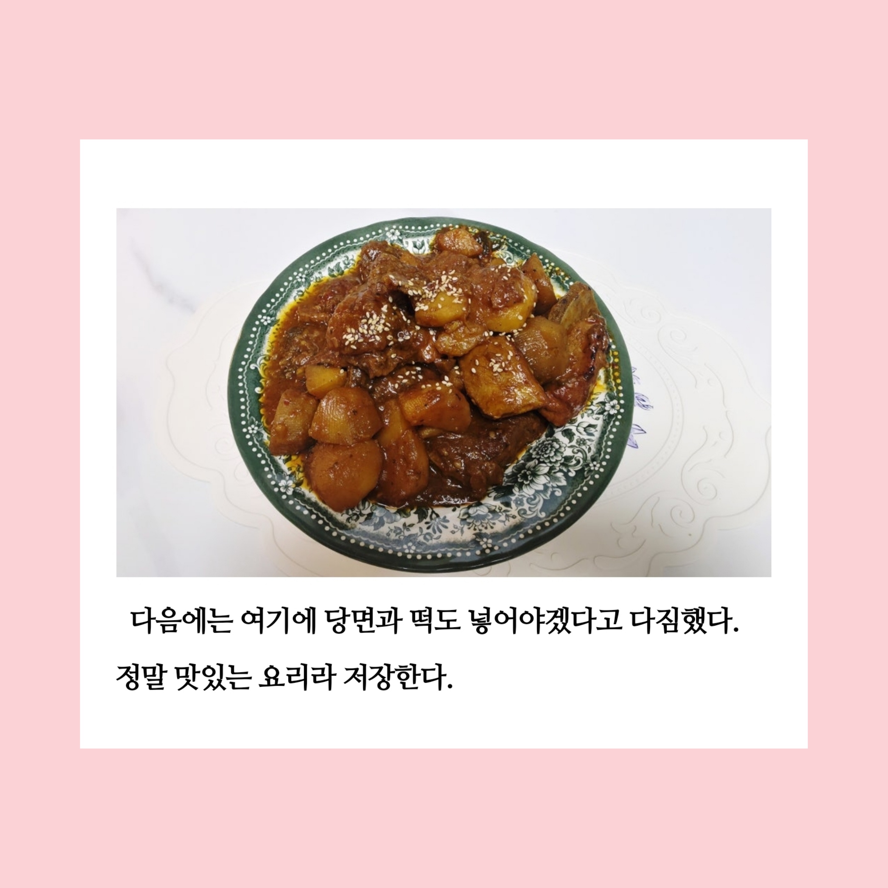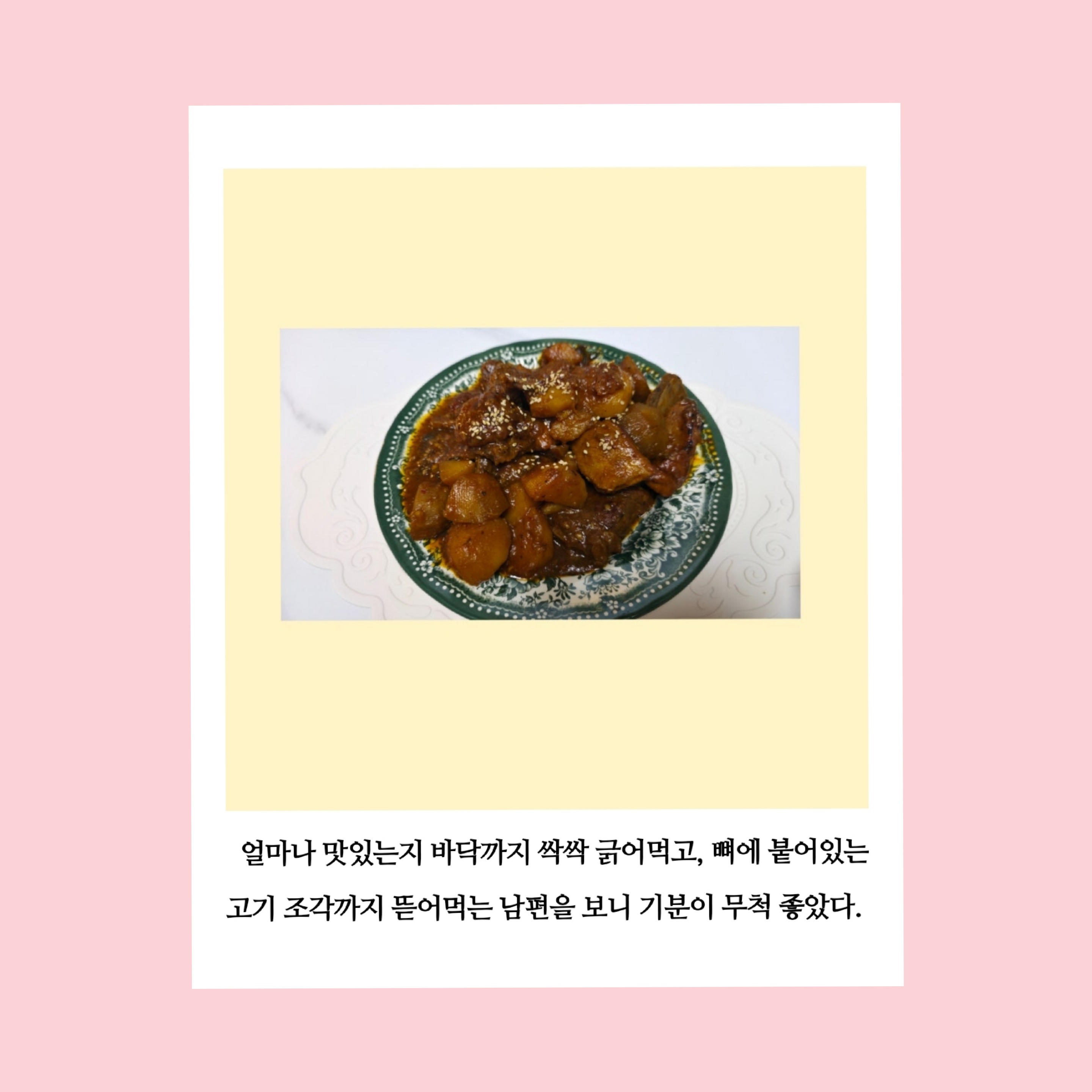 이 메뉴는 200 점이라고 하면서 다음에 또 해달란다. 너무 맛있다며 웃는 남편의 입술 주변에 붉은 양념이 가득 묻어있었다. 아주 야무지게 뼈에 붙은 고기를 한 점도 남지 않게 뜯어 먹는 걸 보니 내 마음이 가득해졌다. 이게 바로 인정 욕구인가. 싶어 웃음이 났다. 다음에 할 때는 고기를 더 많이 넣고 당면과 떡을 추가해야겠다고 다짐했다. 매일 같이 맛있게 잘 먹는 남편을 보면 참 행복하다. 별거 아닌 것 같아도 내 손에서 뭔가 만들어지는 느낌이 참 좋아서 요리를 자꾸 하게 된다. 돈도 아끼고, 건강도 챙기고, 행복도 가득한 요리라니. 내가 이렇게 가정적이었나 싶은데.. 어쩌다 보니 요리도 취미가 됐다. 요리 덕분에 취미 부자. 오늘 저녁엔 맛있는 김밥과 계란 국을 할 생각이다. 오늘도 메뉴 변경 없이 그대로 먹겠다는 남편이 출근하면서 집에 빨리 돌아오고 싶다는 말을 하며 집을 나섰다. 돌아오고 싶은 집, 편안한 집, 평안이 가득한 집을 만드는 것이 꿈이었는데 내 꿈이 또 이뤄졌다. 살다 보면 내가 원했던 것들이 전부 이뤄질 거라는 생각에 기대된다.